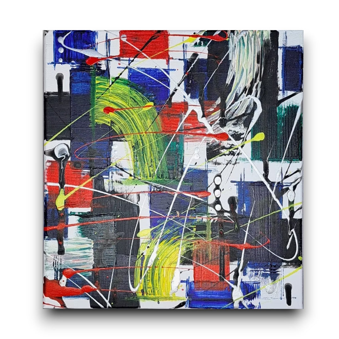 Produced using an acrylic paint pouring technique. Acrylic paint is combined with a pouring medium, silicone and water. The different paint colours are then poured into each other and disseminated by tilting the painting surface.
